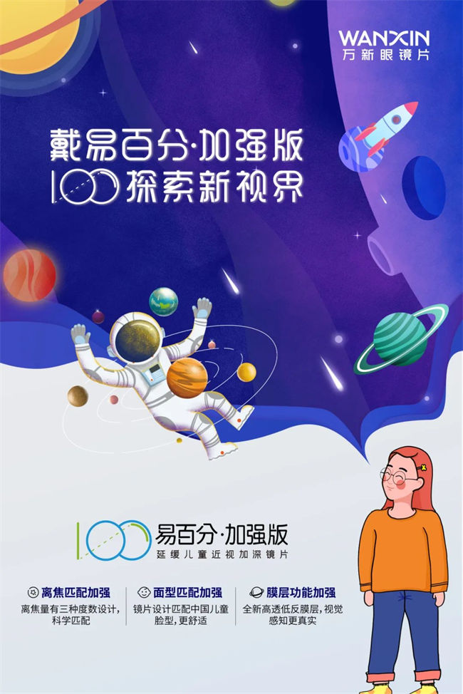 為了滿足大家日益增長(zhǎng)的近視防控需求,萬新推出了易百分·加強(qiáng)版延緩兒童近視加深鏡片,在保留了易百分的核心功能基礎(chǔ)上,增加三大強(qiáng)化功能:離焦匹配加強(qiáng)、面型匹配加強(qiáng)、膜層功能加強(qiáng),延緩近視效果更好,近視兒童青少年的佳選!