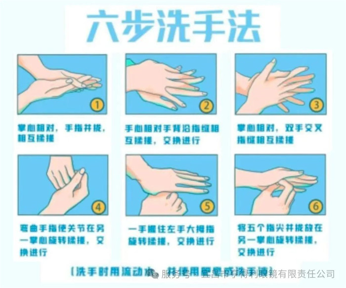 2. 飯前便后、外出回家后,摘戴塑形鏡時(shí)要洗手,用中性的肥皂或洗手液“六步洗手法”并保證20秒以上的時(shí)間。用流動(dòng)水徹底沖洗雙手。